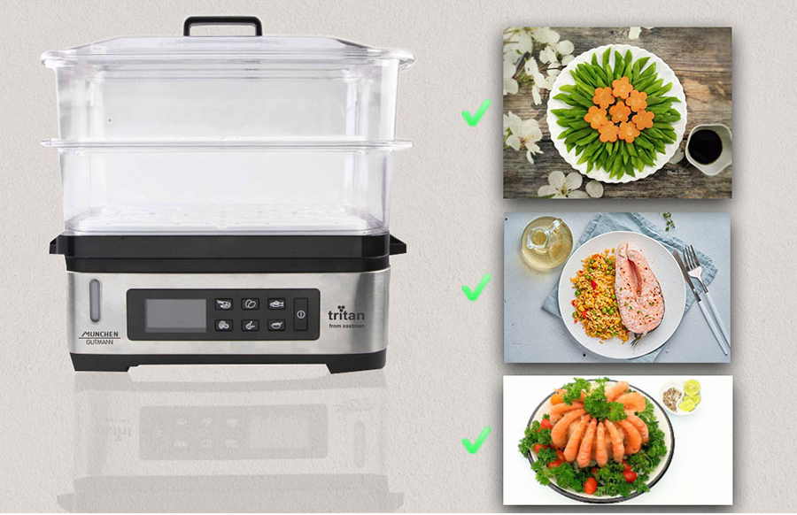 Nồi hấp Munchen MTR6 được thiết kế với hình dáng nhỏ gọn, đẹp mắt và đầy tiện nghi. Nồi hấp 2 tầng của Munchen được làm từ nhựa Tritan (BPA free) để đảm bảo độ an toàn, độ bền cho người tiêu dùng. Nhựa Tritan hoàn toàn đảm bảo an toàn cho người tiêu dùng với khả năng chịu nhiệt tốt, nhẵn bóng, khó trầy xước và không hề chứa chất độc hại BPA.