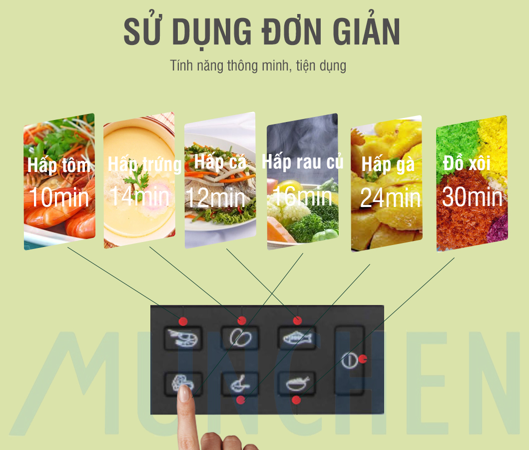Nồi hấp Munchen MTR6 được tích hợp 6 chương trình hấp cho từng loại thực phẩm khác nhau, với mức nhiệt và thời gian hấp khác nhau, người nội trợ tha hồ lựa chọn khi chế biến các món hấp cho gia đình