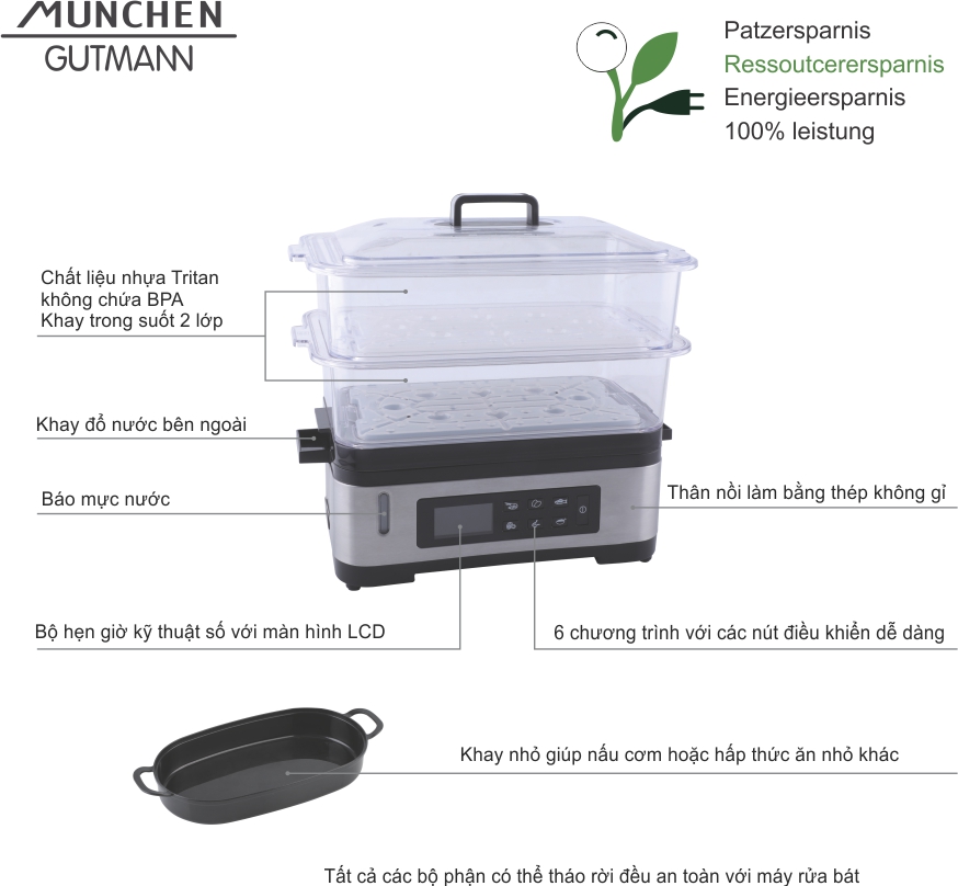Có thể phân chia hấp các món trên 2 ngăn hấp của nồi hấp Munchen MTR6 . Các ngăn tháo lắp rất đơn giản dễ dàng vệ sinh, có rãnh khớp ngăn bay hơi và chống xê dịch.